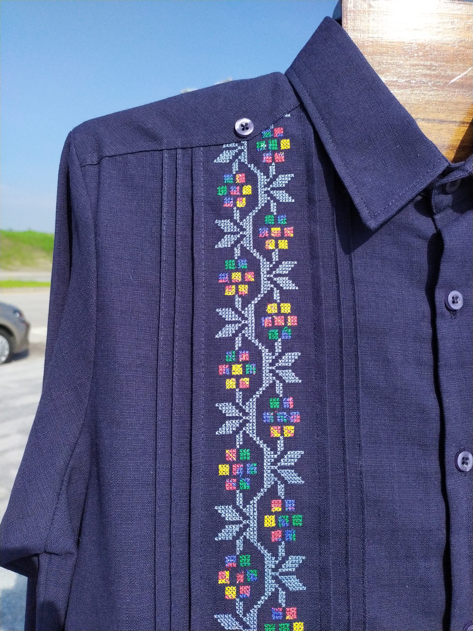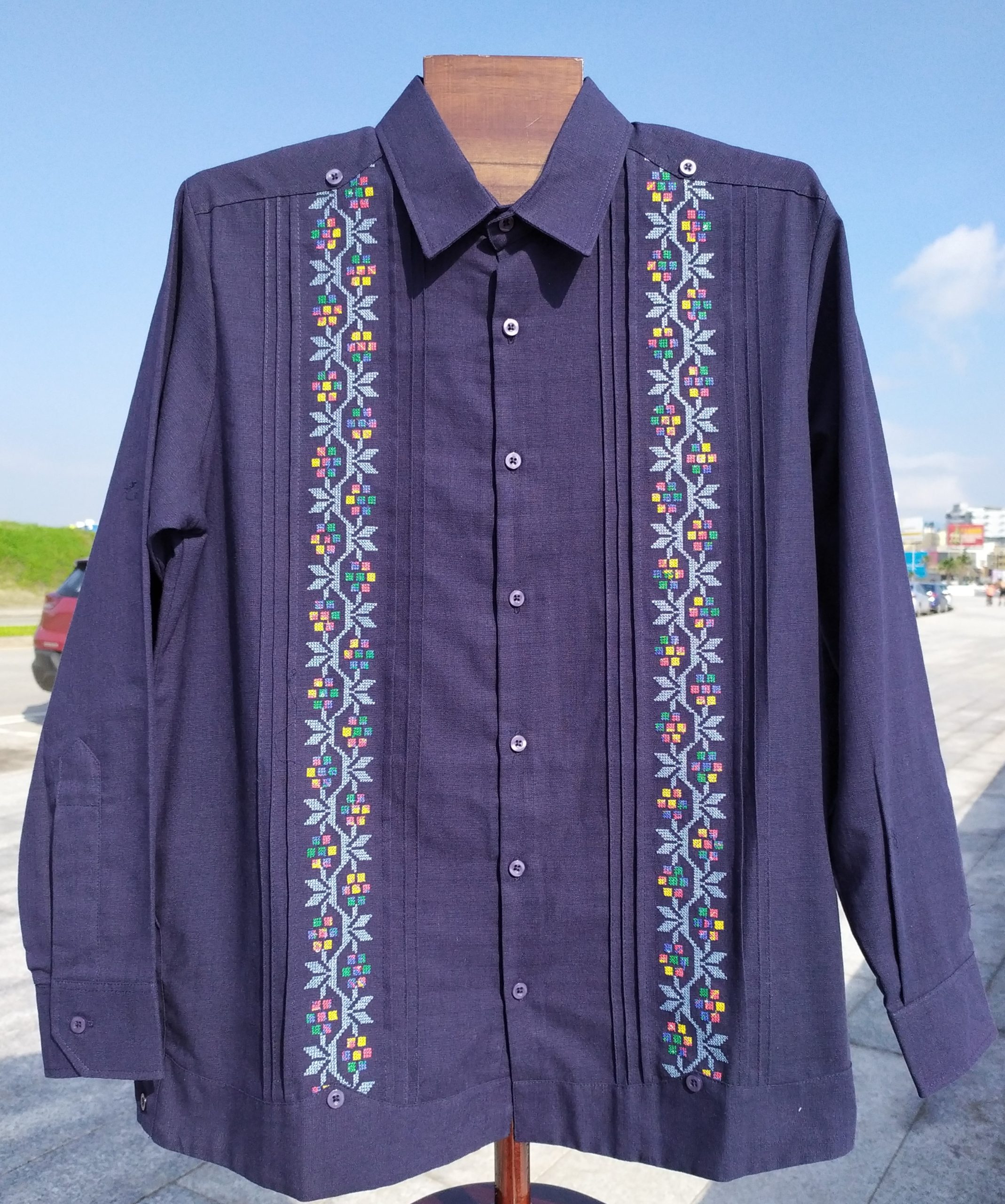 Perfecta para lucir en cualquier ocasión especial, esta guayabera tiene el toque de un bordado de flores a punto de cruz en un lado y alforzas delanteras y traseras que denotan elegancia a primera vista. En color blanco, la mezcla de lino y algodón de la tela la hace muy cómoda y transpirable.