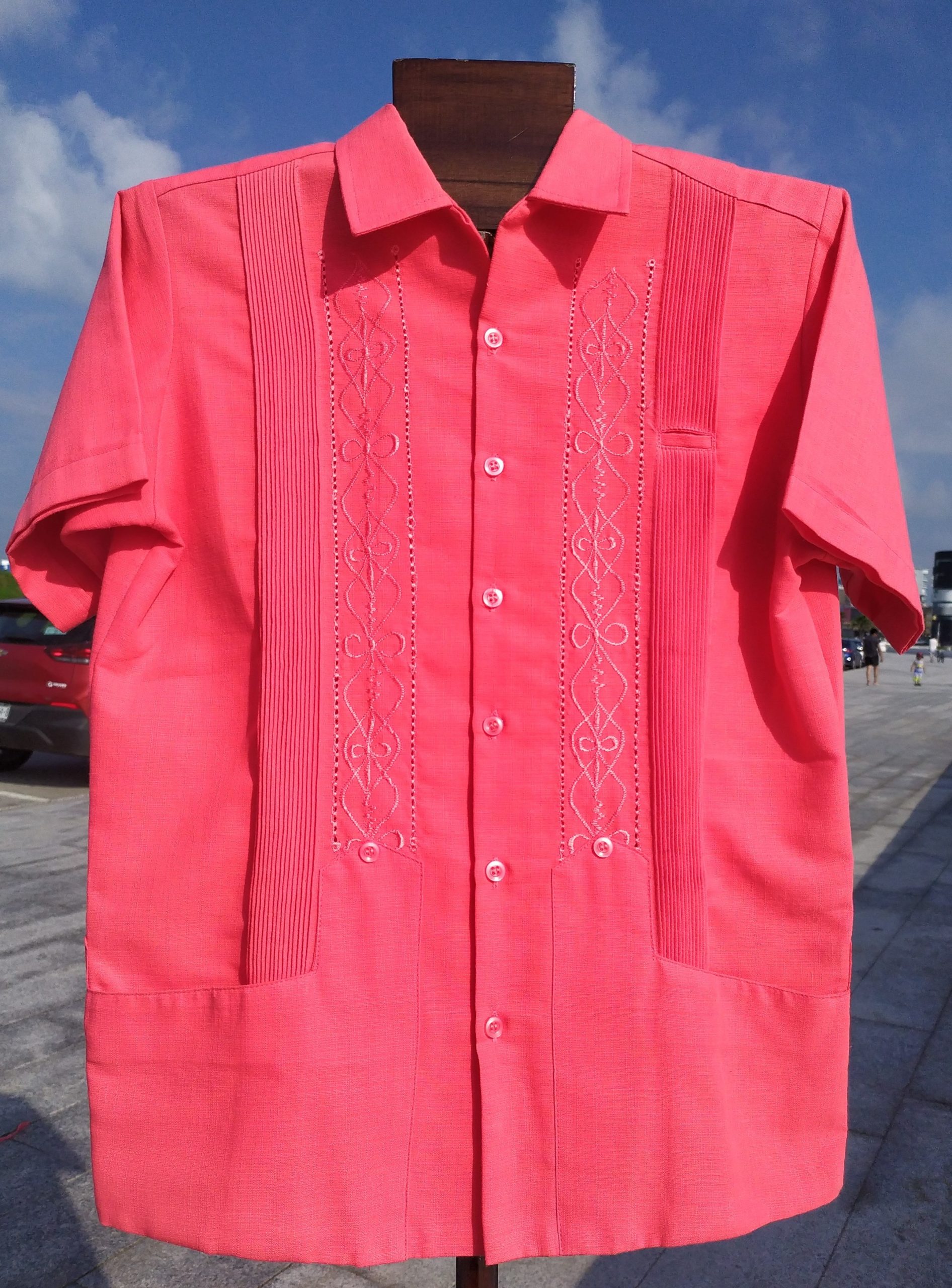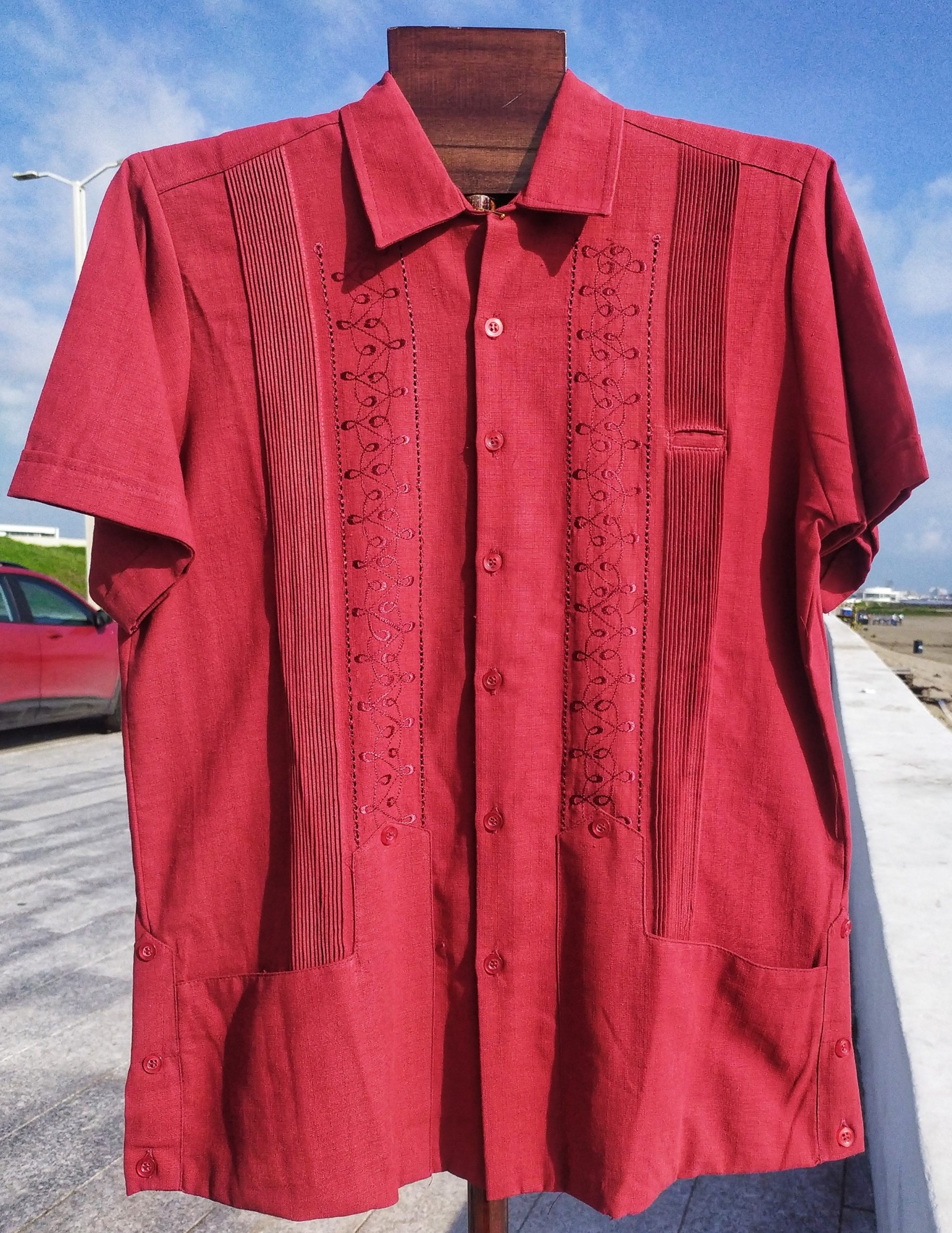 La guayabera rejilla es una prenda tradicional yucateca que se destaca por sus adornos: las clásicas alforzas frontales, un delicado rejillado picueta, su sutil bordado monocromático y las características bolsas en la parte inferior que la hacen una prenda que no puede faltar en tu clóset.