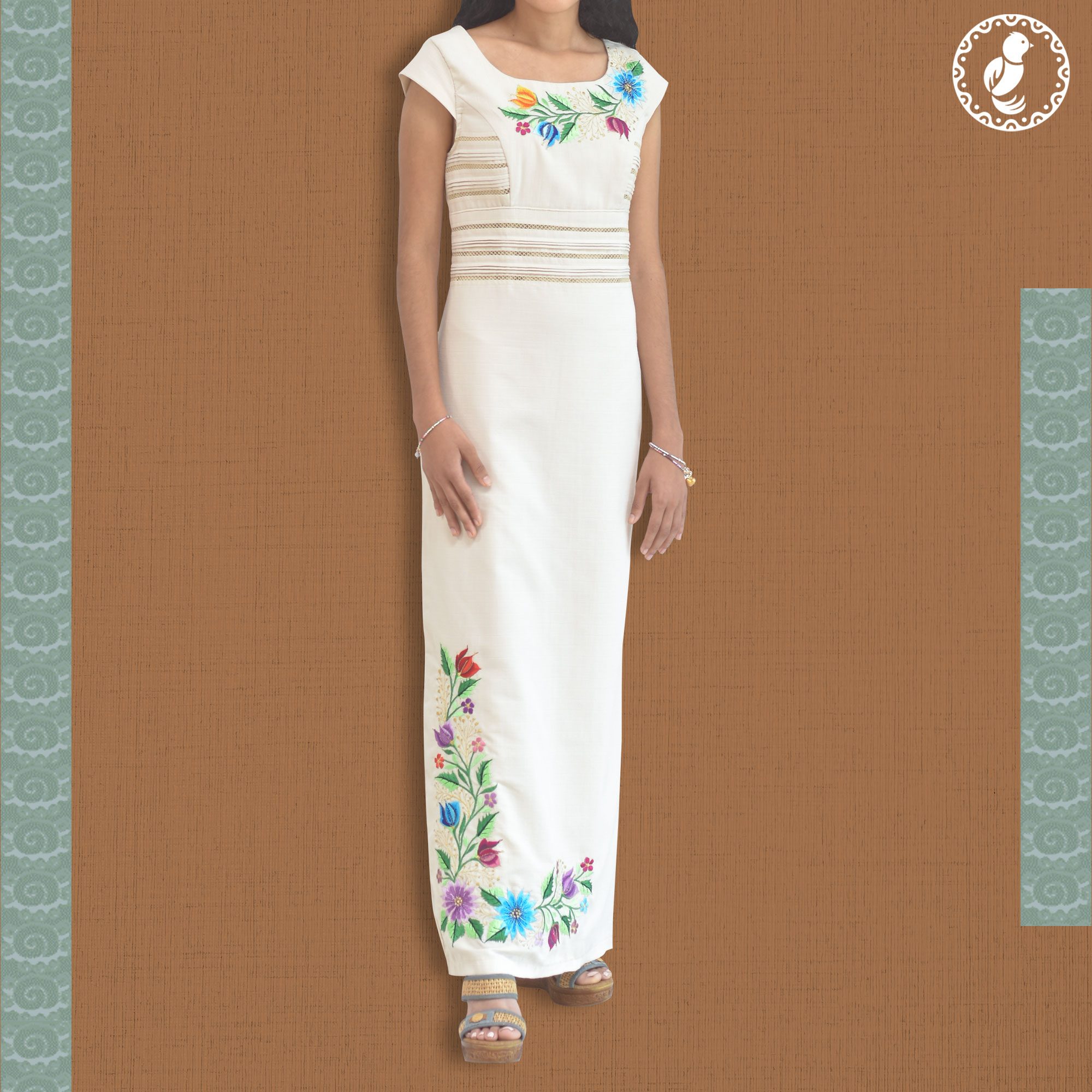 El vestido Kaab, es un original diseño yucateco ideal para vestir tanto de día como de noche. El nombre de este modelo es una palabra maya que significa tierra, el elemento natural más importante para los mayas. Tiene mangas cortas que lo hacen lucir perfecto para fiestas y eventos especiales. La elegancia de este vestido se ve acentuada por el trabajo de alforzas y los detalles de costura picueta en las zonas del busto y de la cintura. ¡Sus bordados florales con sutiles matices magnifican su huella mexicana!